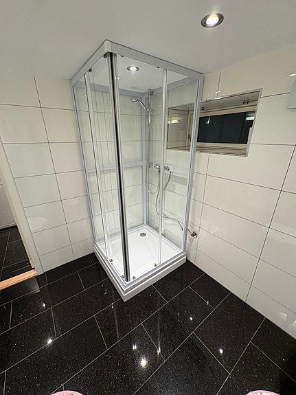 Bad med stor servant og dusj. Eget lite rom som skiller for vaskemaskin og tørketrommel.