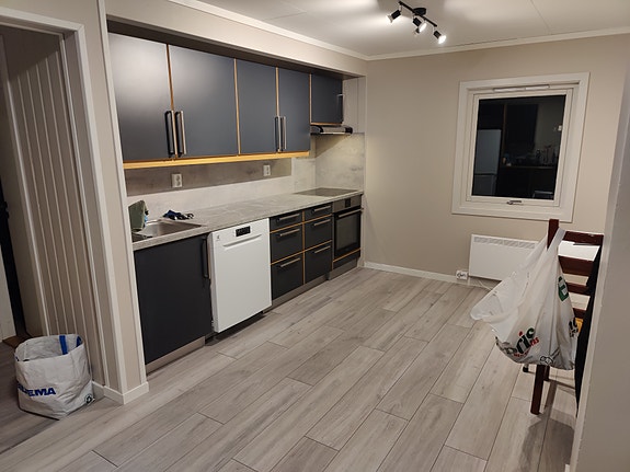 romslig kjøkken m. komfyr, platetopp, oppvaskmasin og kombinert kjøle og fryseskap