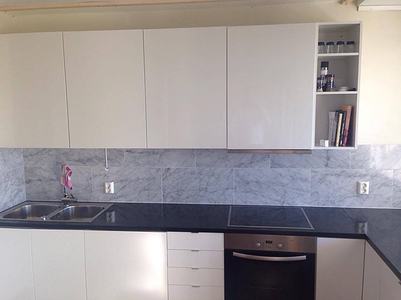 Tiled bathroom with shower, washing machine, and dryer. Living room with open kitchen solution from Unoform, integrated appliances, and separate fridge/freezer. Bedroom with double bed (160 cm) and closet. Spacious storage room for wardrobe/storage adjacent to the entrance.