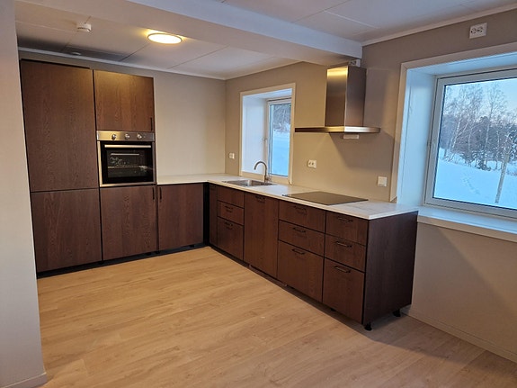 Varmekabler i gulvet på stue/kjøkken og gang. To store soverom, romslig gang og bod til oppbevaring.