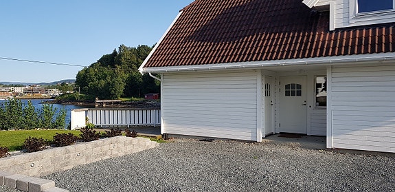 Leiligheten ligger i et rolig området med kort avstand til sentrum. Leiligheten har parkettgulv i primær rom - flisgulv (med varmekabler) i entre og bad. Leiligheten har hvitevarer som oppvaskmaskin, vaskemaskin, kombiskap kjøl/frys, komfyr. Leiligheten ligger helt nede ved sjøen i en egen enhet (garasje) og disponerer en egen liten terrasse samt egen parkeringsplass til 1 bil.