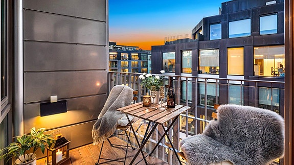 Privat balkong i 8. etasje med kveldssol, kanalutsikt og sjøgløtt. Skjermet og tilbaketrukket, godt hevet over bylivet
