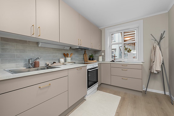 Kjøkkenet er som resten av leiligheten nyrenovert og har en gjennomgående pen standard med delikate farger