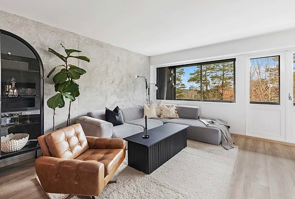 Kombinasjon av rustikk pusset mur og malte vegger. Store vindusflater og utgang til balkong.