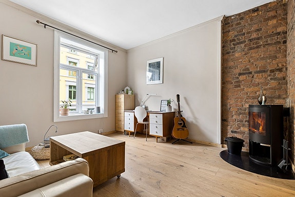Lys og sjarmerende 2-roms med balkong. Lys entré med dørcalling og mulighet for klesoppheng. Romslig stue med synlig murvegg og peis. Moderne kjøkkeninnredning utstyrt med vaskemaskin, platetopp og kjøleskap. Flislagt bad med varme i gulv og dusj. Innbydende soverom med garderobeskap og plass til dobbeltseng, det er også utgang til balkong. Varmtvann er inkludert i husleien.