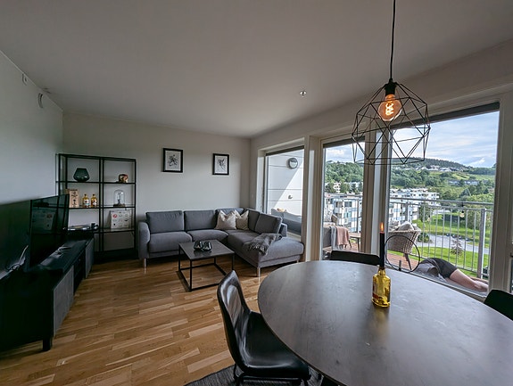 Store vindusflater mot stuen gir en lys og trivelig leilighet. Kona som etter beste evne forsøker å gjemme seg på balkongen medfølger ikke i leieforholdet.
