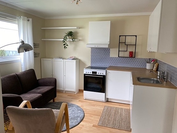 Lyst og luftig med to store soveromsvindu. Oppholdsrom med kjøkken, sittegruppe, sovealkove, bad og gang.