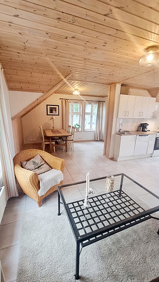 Fullt møblert leilighet (inkl kopper, kar og komplette hvitevarer) i portnerbolig leies ut på korttidskontrakt (leies ikke ut som permanent bolig).