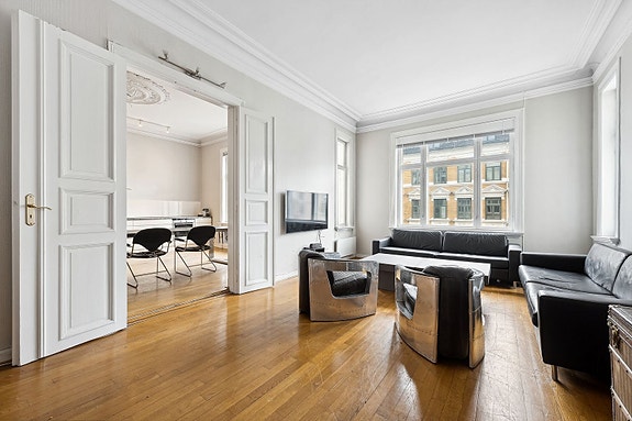 Stor og romslig stue med godt lysinnslipp og sjenerøs takhøyde.