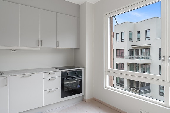 Kjøkkenet er utstyrt med integrerte hvitevarer som kjøl/frys, komfyr, steketopp og oppvaskmaskin. Kjøkkeninnredningen består av lys grå fronter og benkeplate i lys betong. Åpen kjøkkenløsning som gir en god romfølelse.
