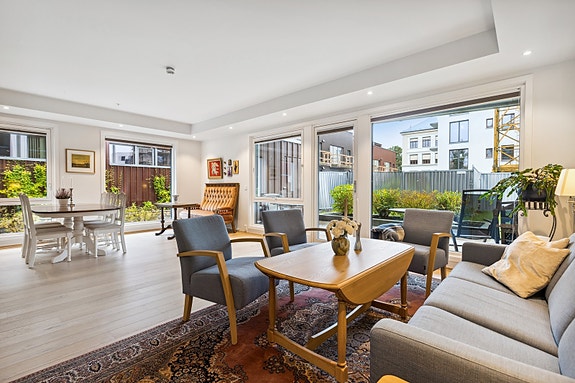 - Åpen stue/kjøkkenløsning med integrerte hvitevarer.
