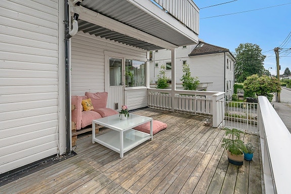 Vestvendt veranda og plen på baksiden av huset: Perfekt for å nyte solen hele dagen.