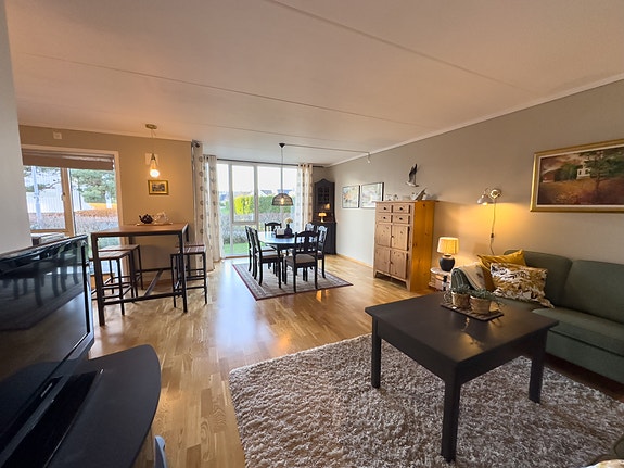 Leilighet i første etasje med terrasse, stor stue/kjøkken, 2 soverom, bad, vaskerom boder og parkering i kjeller. Ledig fra d.d.