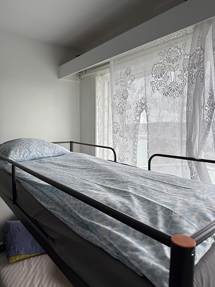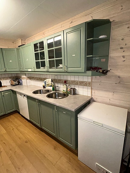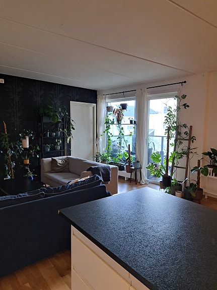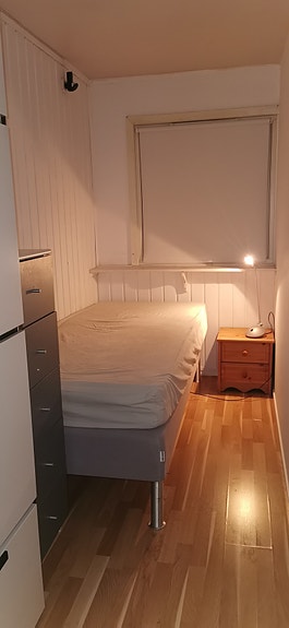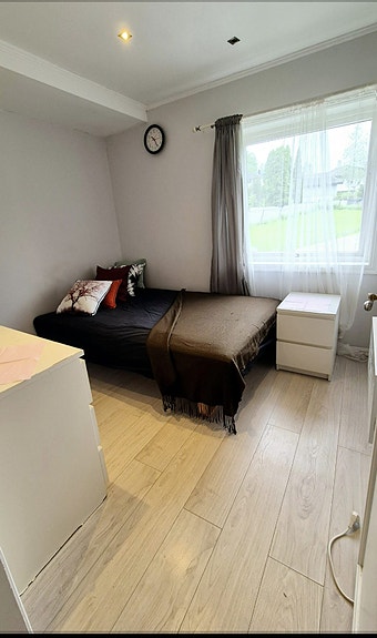 Leiligheten ligger i 2. etasje og har fem soverom, to bad, to balkonger og en romslig stue. Her bor det fire voksne (tre menn og én kvinne) som alle jobber mer enn fulltid. De er svært hyggelige, og siden de sjelden er hjemme, er leiligheten som regel stille og rolig