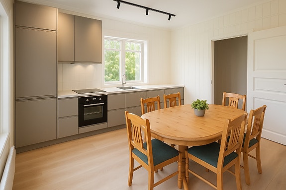 Nytt kjøkken 2025. Fullt innredet. To store vinduer samt spisebord gjør dette til et naturlig rom for sosiale sammenkomster.