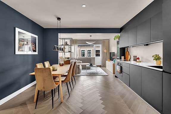 Leiligheten holder gjennomgående høy standard etter totaloppussing i 2022. Den har moderne Kvik-kjøkken med integrerte hvitevarer, delikat flislagt bad med varmekabler og kvalitetsmaterialer. Gulvene er belagt med elegant fiskebensparkett i eik, og store vindusflater gir godt lysinnslipp. Takhøyden på 2,61 m gir en luftig romfølelse, og det er innfelte downlights i gang og bad.