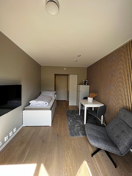 Her kan du flytte rett inn - hybelen er fullt møblert med bla. seng, garderobeskap, "go-stol", sofabord, tv, tv-benk, spisebord og spisestuestoler. Kjøkkenet har induksjonstopp, stekeovn, kjøleskap (med liten fryser) og oppvaskkum. Badet er moderne med tidsriktige fliser på gulv og vegg, regnfalldusj, moderne innredning og vaskemaskin. Tørketrommel medfølger ikke.