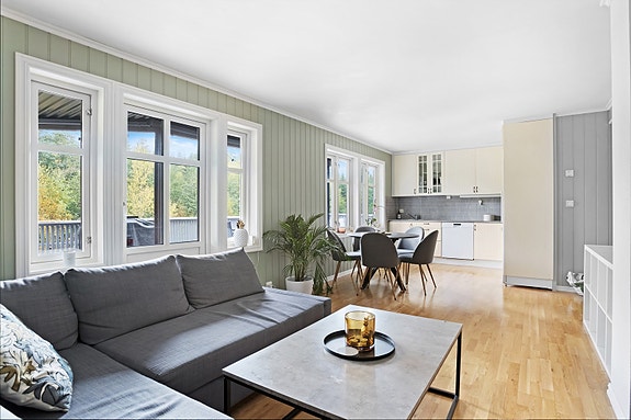 Hyggelig 2-roms på 53 kvm med egen inngang og privat uteplass på ca. 40 kvm. Leiligheten har en usjenert utsikt mot frodig skog, som også byr på flotte turløyper og lysløyper på vinterstid. Stue med gulvvarme og åpen kjøkkenløsning samt utgang terrasse. Romslig soverom med god oppbevaringsplass.