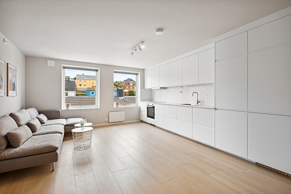 • Åpen stue/ kjøkken løsning med sofakrok, tv og spisebord. Entre med gang og plass til å henge fra seg.
