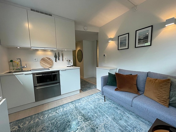 Møblert med seng, sofa, spisebord, TV og stoler. Noe kjøkkenutstyr. Ny vaskemaskin fra 2025.