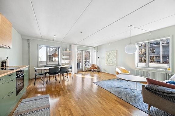 En lys og moderne 3-roms leilighet beliggende i en flott bygård. Leiligheten ligger usjenert til inn mot gårdens rolige bakgård.