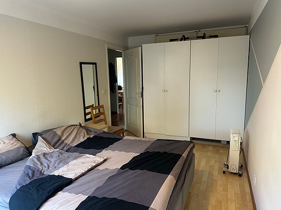 Det store rommet er nok for ett par. Rommet er så stort at det er plassert lesestol, lesebord, nattbord på begge sider, dobbel seng og 2 store garderobeskap… Mulighet å henge tv også….dette rommet er nok for ett par med ett barn også… Leie ut for 8000 inkludert alt depositum 16000kr