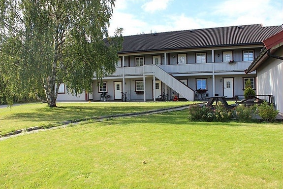 Fasade med flotte grønne arealer, boligen ligger i 2.etasje