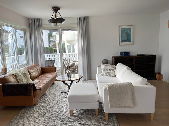 Stor hyggelig leilighet leies ut til ordensfolk. 2 bad. Leiligheten leies ut møblert, og en barneseng som kan lånes ved behov (ikke avbildet). Leiligheten rommer et bad med vaskemaskin og tørketrommel og toalett. Kjøkken med åpen løsning til spiseplass. Koselig sofagruppe med verandadør og romslig veranda med ettermiddagssol.