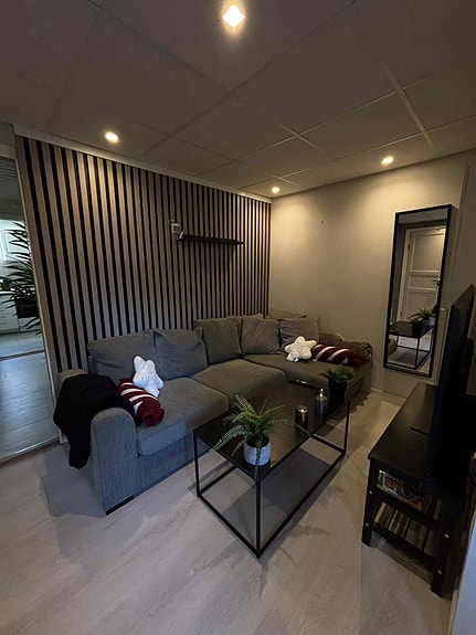Ny stue, med varmekabler, dimmbare spotter, spilevegg:)
