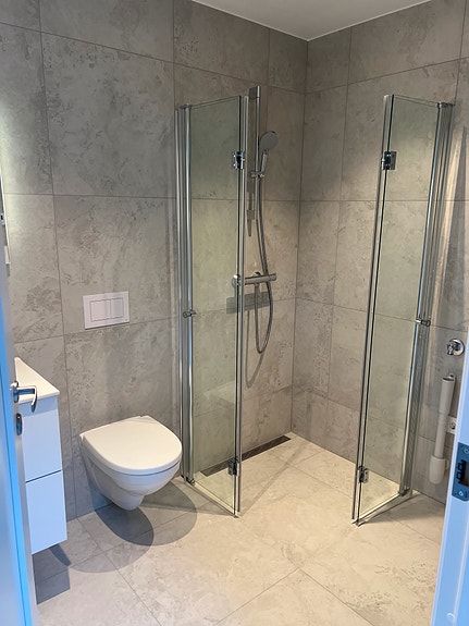 - Stort, pent bad med 60 x 60 cm fliser på vegger og gulv. Opplegg til vask- og tørkemaskin.