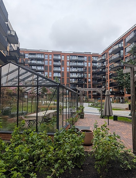 Fra fremsiden av bygget i Børsteveien 15. Felles tilgang til drivhus med samme nøkkel som til leilighet.