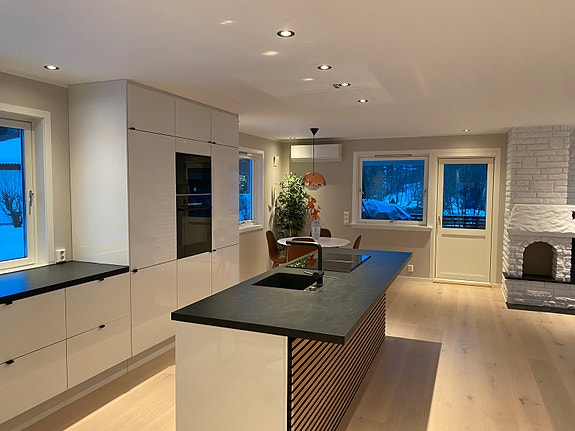 - Lekkert kjøkken med god skap- og benkeplass med hvitevarer.