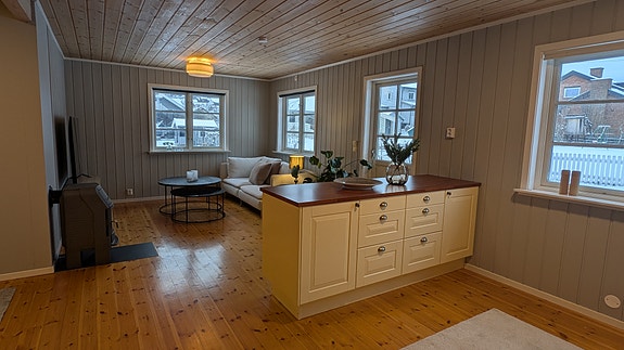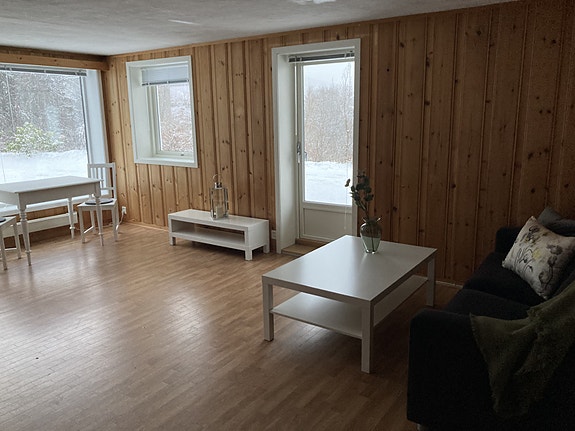 Leilighetens fellesrom er møblert med spisegruppe og sofagruppe og kjøkkenet er utstyrt med det som er nødvendig i hverdagen.