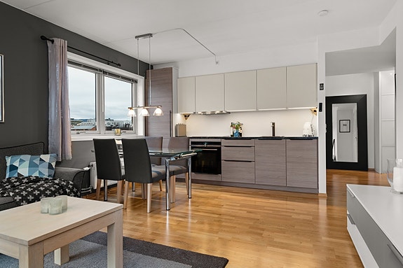 Åpen stue/kjøkkenløsning med kjøleskap, oppvaskmaskin, steketopp + stekeovn på kjøkkenet. Lys og trivelig stue med store vindusflater og utgang til romslig balkong med markise.