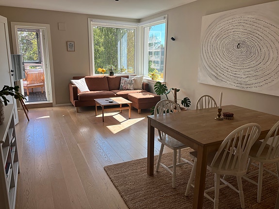 Vi er en liten familie som skal bo et annet sted de neste tre årene og som derfor leier ut leiligheten vår i denne perioden. Leiligheten leies ut møblert med unntak av dobbeltseng og stuebord.