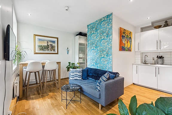 Entre, stue med spiseplass, kjøkken, flislagt bad og ett soverom.