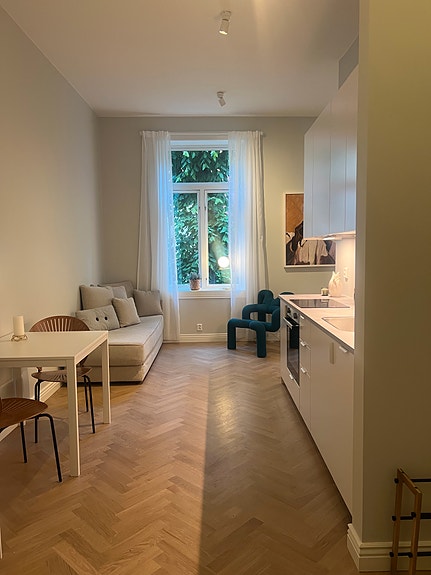 Inkognitogata 17 ligger i en av Oslos mest sentrale gater, omgitt av ambassader og nær byens fineste hotell, Sommerro. Beliggenheten tilbyr enkel tilgang til store grøntområder i Slottsparken og Oslo sentrum, som begge kun er noen få minutters gange unna. Leiligheten er nyoppusset og har en takhøyde på hele 3,3 meter, noe som skaper en romslig og innbydende atmosfære.