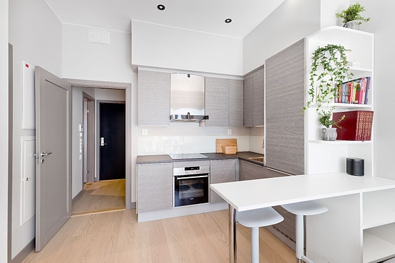 Entrè, bad, soverom, åpen stue-kjøkken løsning og balkong.