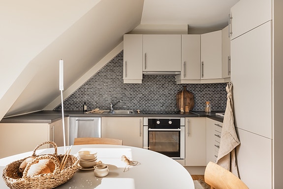 Integrerte hvitevarer: kombiskap, oppvaskmaskin, komfyr.
