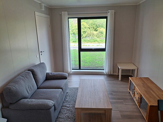 Leiligheten er møblert med hvitevarer, vaskemaskin, seng, garderobeskap, sofa og bord, samt mindre spisebord med 2 stoler.