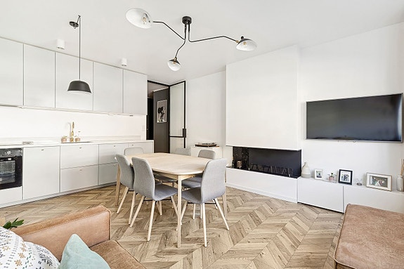 - Gjennomførte overflater med fiskebenslaminat, lune fargevalg og marmordetaljer