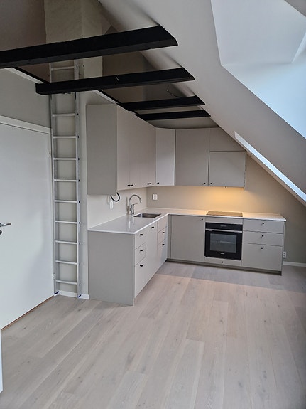 Nyetablert lekker loftsleilighet med fliselagt bad og Ikea-kjøkken med benkeplate i sten. Leiligheten har skråtak og en takhøyde på gode 4 meter, og oppleves derfor som luftig og innbydende. Alt av hvitevarer følger med. Den har en god krok bak trapp som er egnet som en sovealkove eller kontorløsning. Leiligheten har en romslig hems som også kan fungere som gjestesoverom. På grunn av skråvegger oppleves leiligheten større enn det boaraealet tilsier. Leiligheten har et gulvareal på over 60 kvm i tillegg til hems. Vi tilbyr en rabattert leie på 17.000,- frem til 1. august ved innflytting innen 1. mars. Fra og med første august stiger leien til 20.000,- kr/pr. mnd.