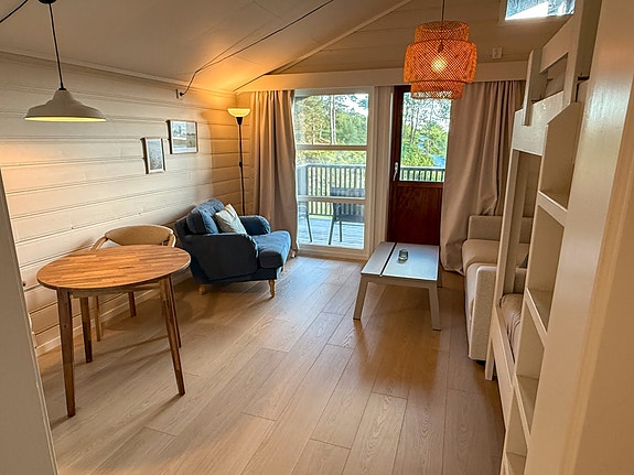 • Fullt møblert med lenestol, sofabord og kjøkkenutstyr