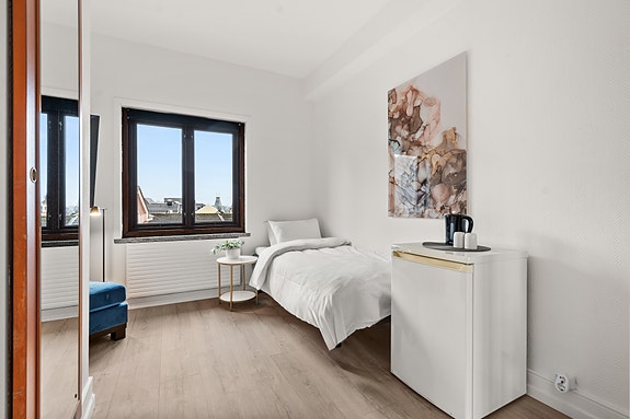 - Fullt møblert og innflyttingsklart: Alle våre rom og leiligheter er innredet med alt fra seng, nattbord, pult, eget kjøleskap, og tv på rommet. Strøm og internett er inkludert i leien.
