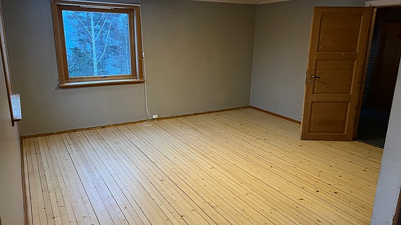 Stue med nyslipt gulv og nylig malte vegger. Kan også benyttes som soverom.