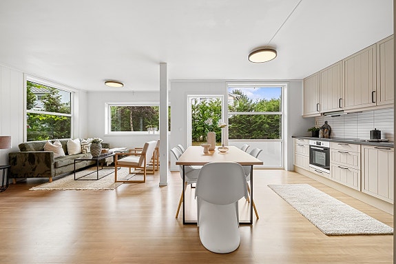 - Leiligheten på over 100 kvm p-areal har god standard med stilige materialvalg, fine farger, store vinduer med mye lysinnslipp.