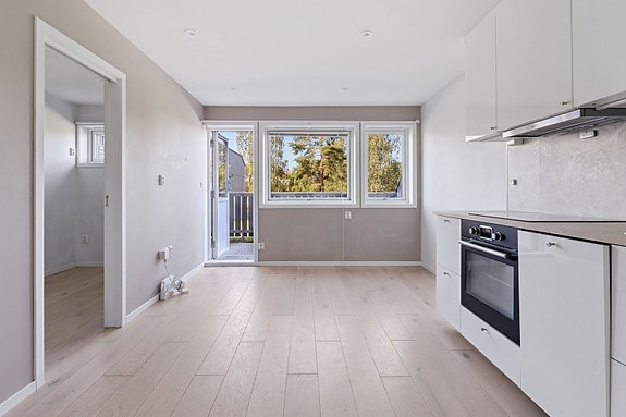Åpen kjøkkenløsning mot stuen. Kjøkkenet har en tidløs og moderne innredning med integrerte hvitevarer.