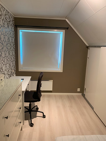 Rommet til leie er i toppetasjen hvor det er to soverom til. Det er og et rom i hovedetasjen som leies ut. Det vil si at fellesarealet deles med tre andre som er i starten av 20 årene.