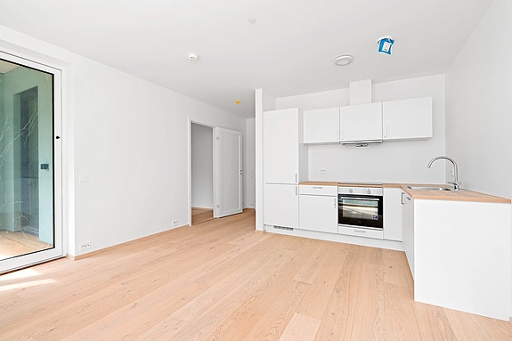 Leiligheten er lys og fin med store vindusflater og har flere møbleringsmuligheter med plass til både spisebord og sofagruppe. Plassbesparende skyvedører fra entré til bad og stue. Pent kjøkken med innredning fra Strai med integrerte hvitevarer. Lekkert flislagt bad med dusjhjørne og opplegg til vaskemaskin. Vannbåren gulvvarme og varmtvann fra fjernvarme. Lagringsplass i innvendig bod.