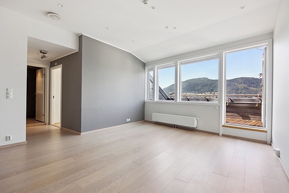 Stuen er lys og kan enkelt møbleres med sofagruppe og spisebord. Fra stuen er det utgang til en balkong med gode solforhold og en flott utsikt mot Store Lungegårdsvannet.